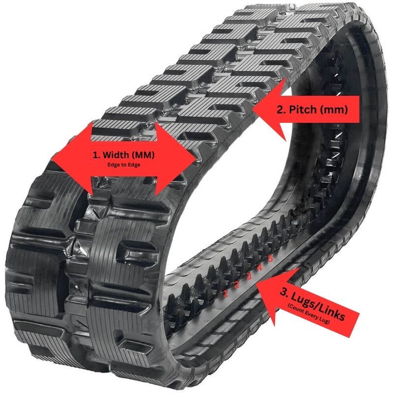 Width (mm) × Pitch (mm) × Lugs/ Links (count). Width is the overall track width; pitch is the distance between lug centers inside the track; lugs/ links is the total number of steel inserts/drive lugs around the track.